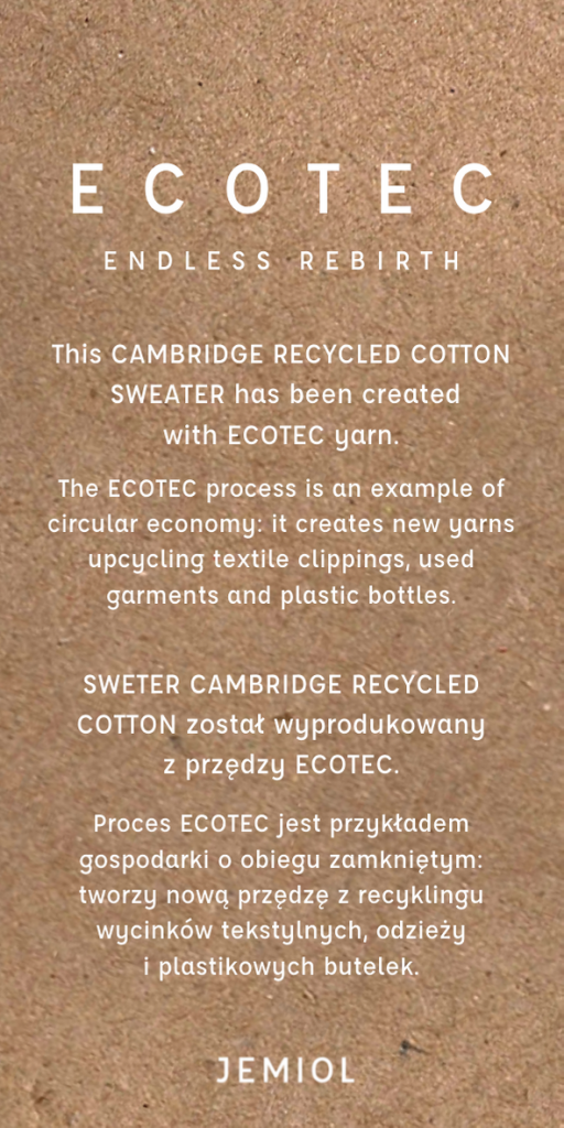 Swetry Cambridge zostały wyprodukowane z przędzy ECOTEC. Proces ECOTEC jest przykładem gospodarki o obiegu zamkniętym: tworzy nową przędzę z recyklingu wycinków tekstylnych, odzieży i plastikowych butelek. Przędza powstająca w procesie ECOTEC jest ukłonem w stronę Planety. Bawełna z recyklingu w znaczący i wymierny sposób ogranicza negatywny wpływ procesów produkcyjnych na środowisko naturalne.
